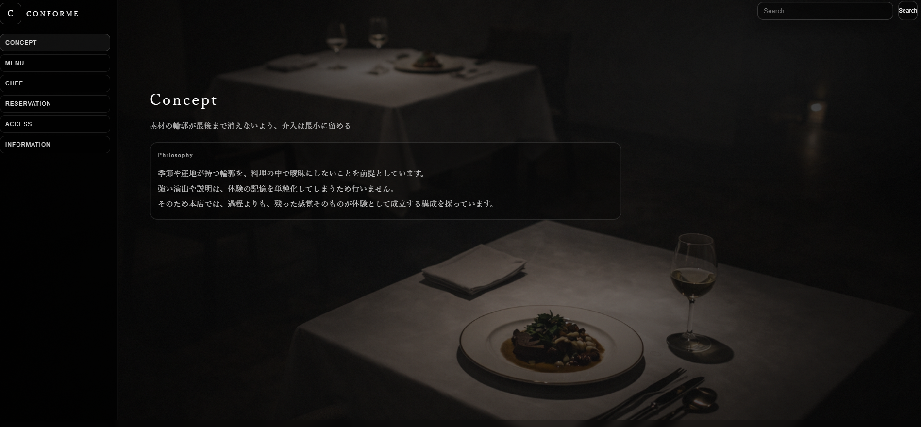 美食家の友人から「完全紹介予約制の特別なレストランに行く」という連絡が届いた。その店の名は「CONFORME」。洗練された雰囲気と独自の料理哲学で知られる、ごく一部の人間しか辿り着けない場所だという。