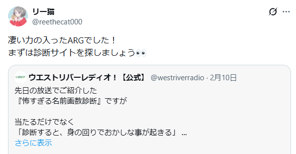 山形県西川町のローカルラジオ局「ウエストリバーレディオ!」のSNSに投稿された、とある名前画数診断の話題がARGプレイヤーの間で注目を集めている。