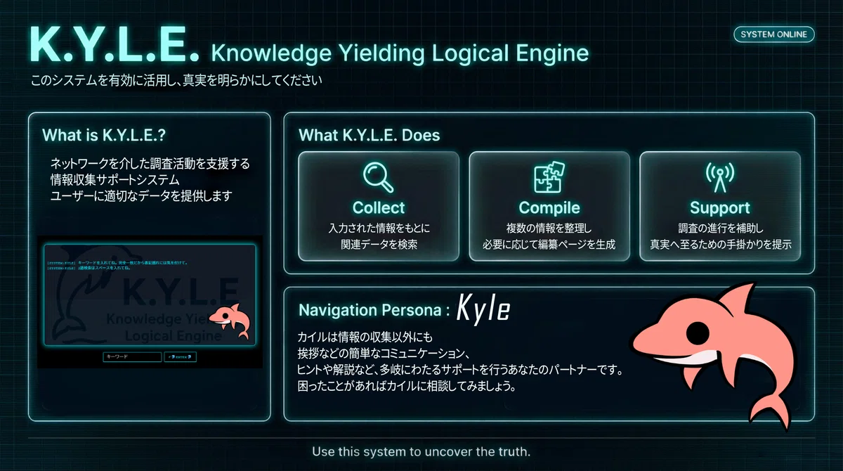 プレイヤーはサポートシステム「K.Y.L.E.(カイル)」を使い、Webサイトを横断しながら真相を調査していく。
